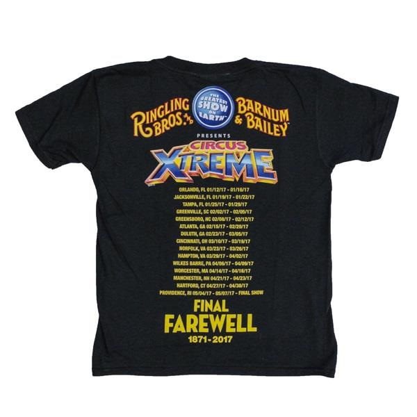 Step right up to the 145th Circus Extreme Farewell Youth Tee! Make sure your young wildcat is sporting this stylish and historic t-shirt, featuring a regal tiger on the front and, on the back, a roll call of all the cities visited on Ringling Bros. and Barnum & Bailey's farewell tour. It's a swan song for the ages—don't miss your chance to join the circus!